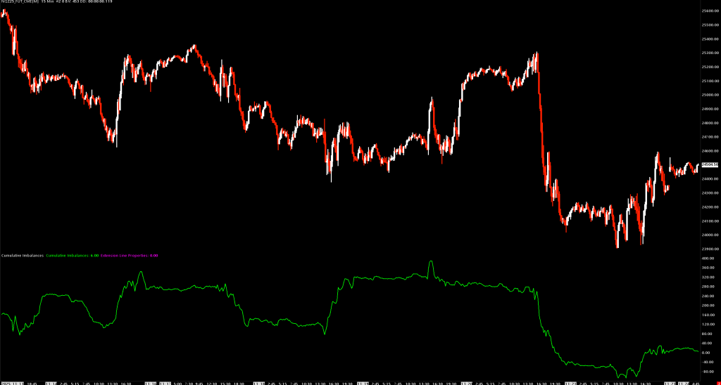 This creates a cumulative delta-style indicator specifically for imbalance events, helping you visualize whether buyers or sellers are winning the imbalance battle over time.