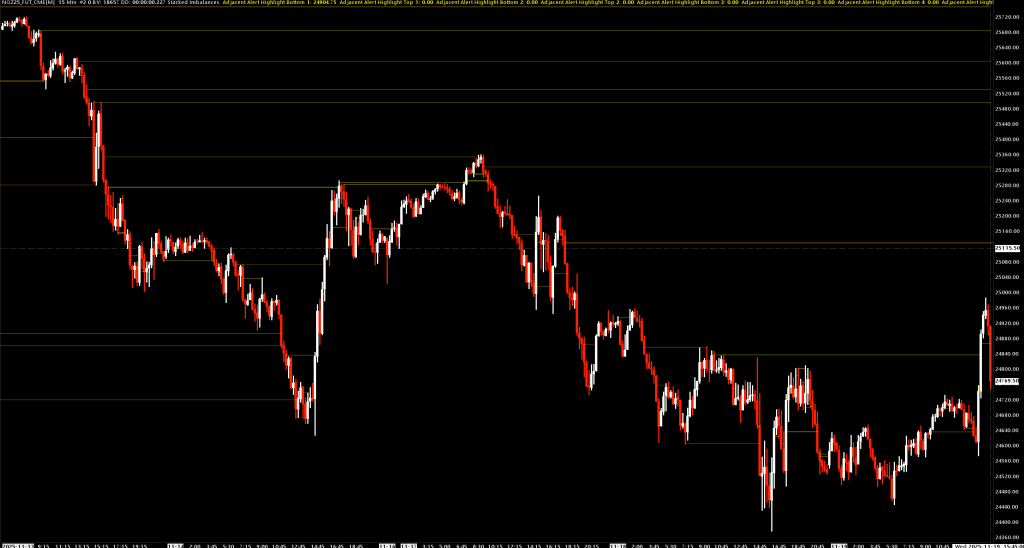 Set Highlight Adjacent Alerts Minimum Group Size to 3+ to identify stacked imbalances where multiple consecutive price levels show the same directional bias.